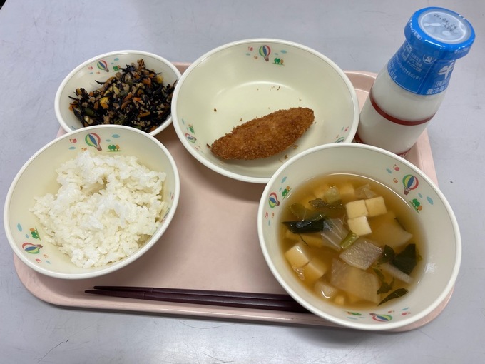 ごはん、牛乳、サーモンフライ、ひじきの炒め煮、吉野汁