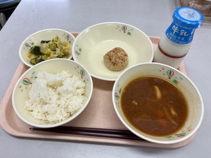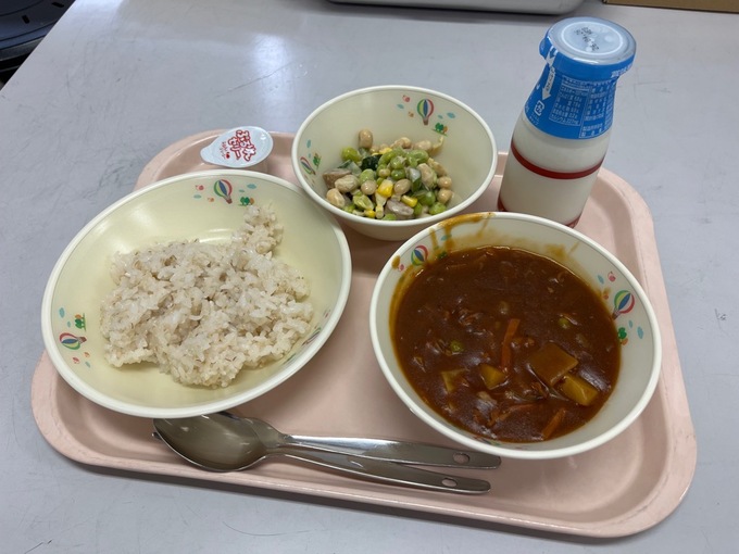 ごはん、牛乳、ハヤシライス、ビーンズサラダ、ミニりんごゼリー