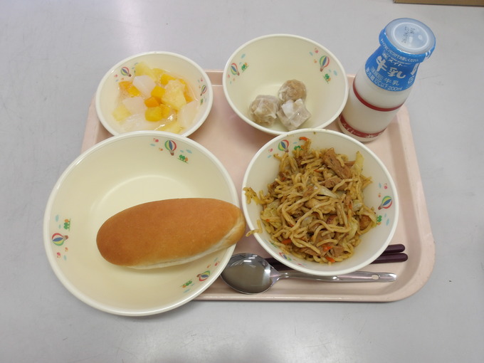 ごはん、牛乳、焼きそば、しゅうまい、フルーツ杏仁