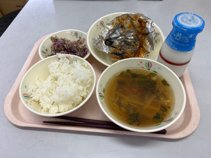 ごはん、牛乳、さばの銀紙焼き、ゆかりあえ、沢煮わん