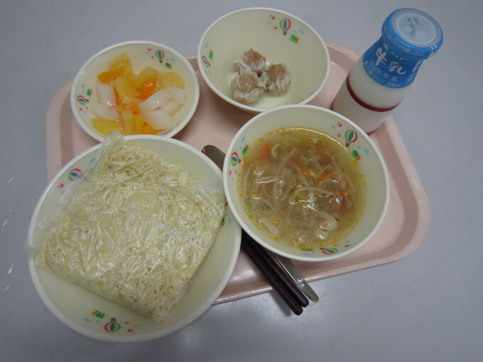 中華めん、牛乳、野菜たっぷり塩ラーメン、しゅうまい、フルーツ杏仁