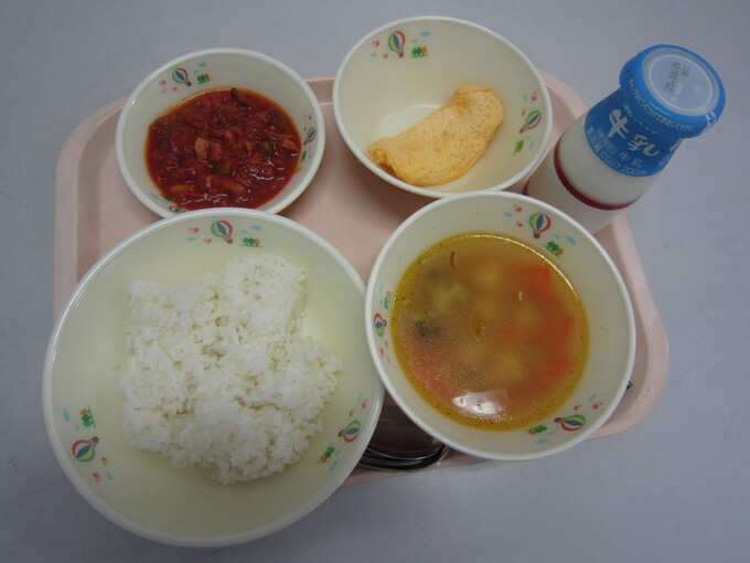 ごはん、牛乳、チキンライスの具、オムレツ、ポテトのスープ
