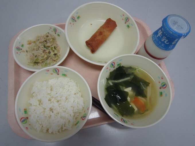 ごはん、牛乳、春巻き、バンバンジーサラダ、わかめスープ