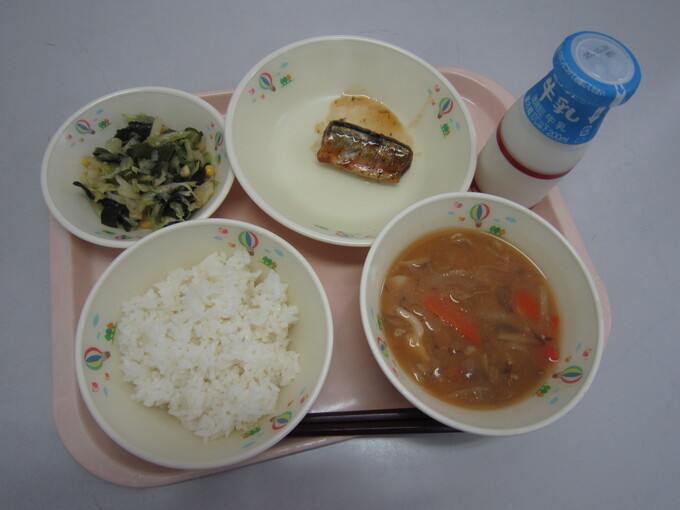 ごはん、牛乳、さんまの甘露煮、和風サラダ、さつまいものみそ汁