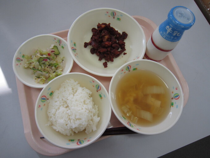 ごはん、牛乳、清須からあげ、梅風味あえ、すまし汁