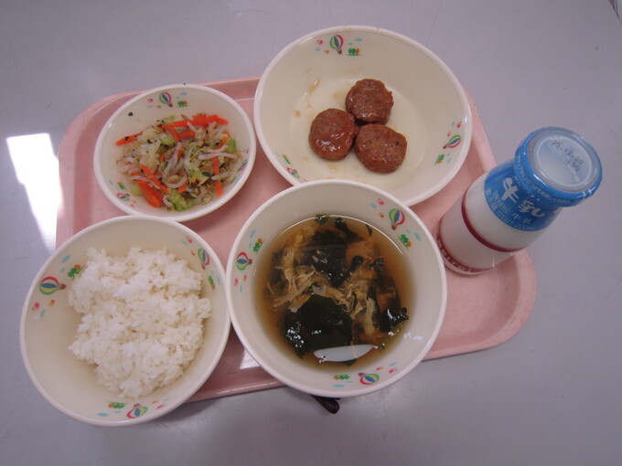 ごはん、牛乳、白ごまつくね、青菜あえ、かきたま汁