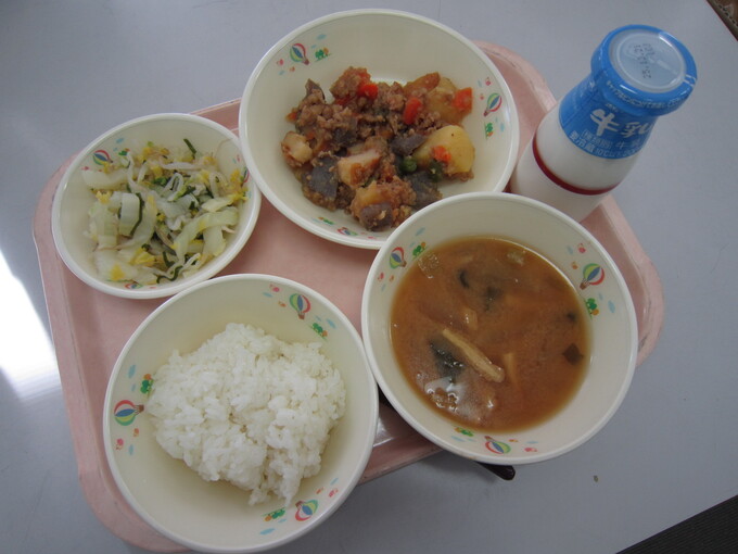 ごはん、牛乳、じゃがいものそぼろ煮、即席漬け、あわせみそ汁