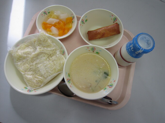 中華めん、牛乳、とんこつラーメン、春巻き、フルーツ杏仁