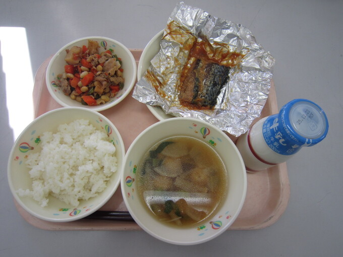 ごはん、牛乳、さばの銀紙焼き、五目煮豆、鶏だんご汁、ココア牛乳のもと