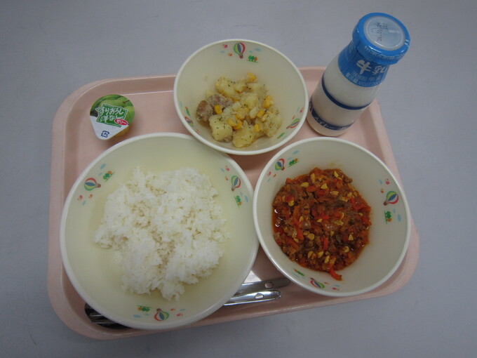 ごはん、牛乳、ドライカレー、ジャーマンポテト、ミニ洋梨ゼリー