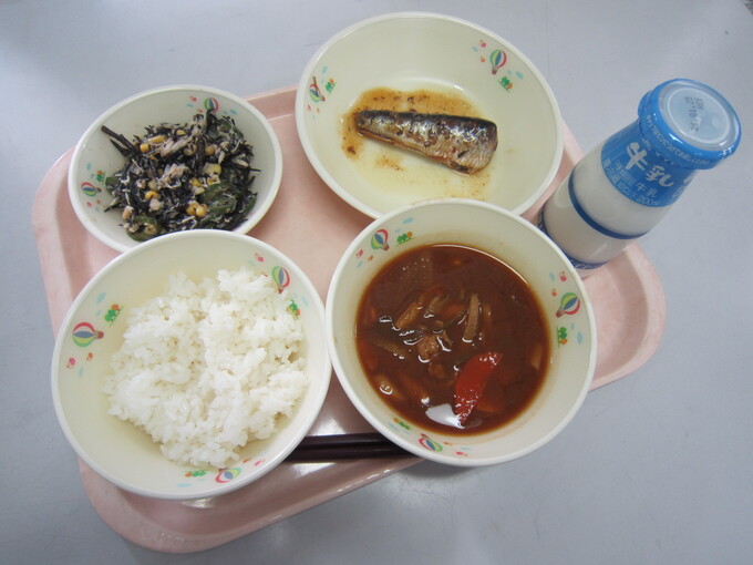 ごはん、牛乳、いわしのしょうが煮、ささみとひじきのさっぱりあえ、豚汁