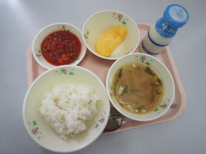 ごはん、牛乳、チキンライスの具、オムレツ、ジュリエンヌスープ