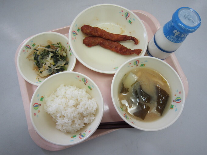 ごはん、牛乳、ししゃもフライ和風ソース、清須はくさいのおひたし、白みそ汁