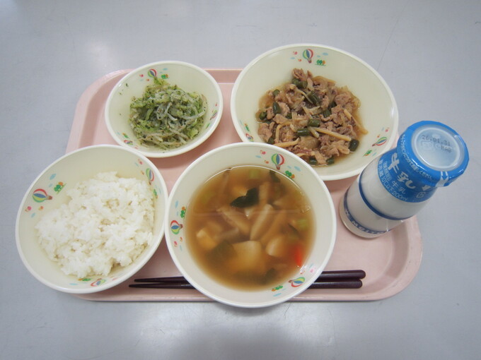 ごはん、牛乳、豚肉のしょうが炒め、かおりあえ、けんちん汁