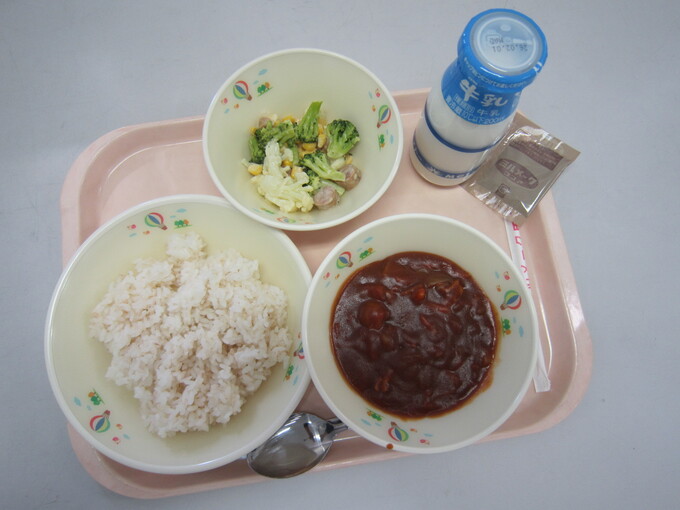 麦ごはん、牛乳、ハヤシライス、花野菜のサラダ、ココア牛乳のもと