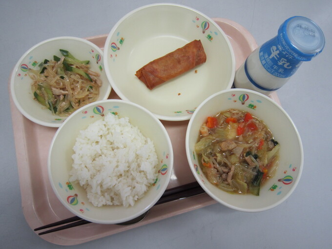 ごはん、牛乳、中華飯のあん、春巻き、バンサンスー