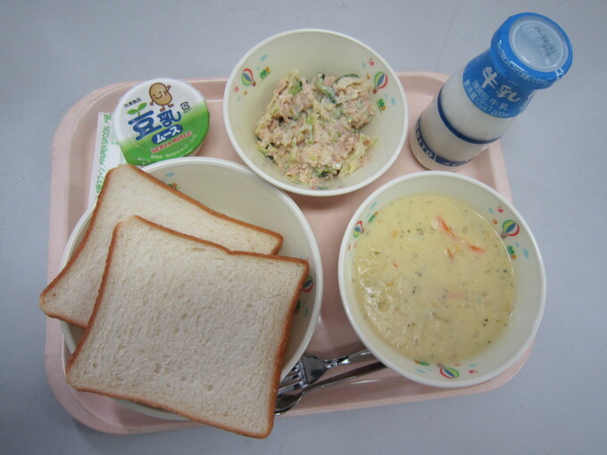 スライスパン、牛乳、セルフツナサンドの具、コーンクリームスープ、豆乳ムース