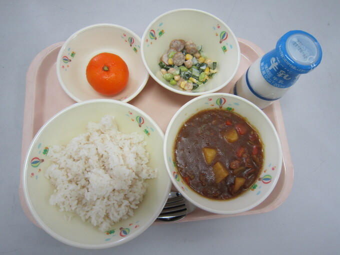 麦ごはん、牛乳、カレーライス、ビーンズサラダ、みかん