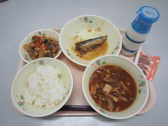 ごはん、牛乳、いわしの梅煮、五目煮豆、豚汁、コーヒー牛乳のもと