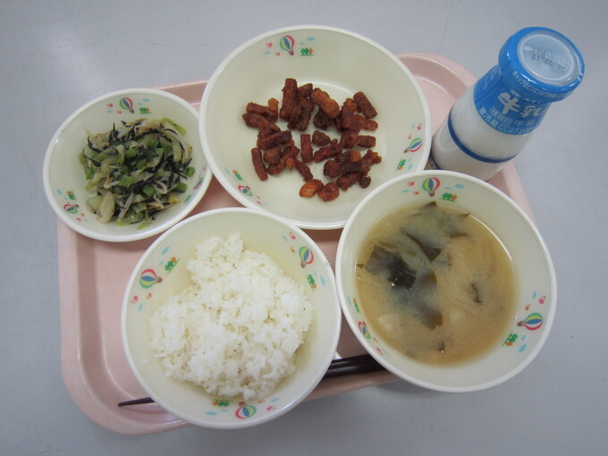 ごはん、牛乳、豚肉のかりん揚げ、しそひじきあえ、白みそ汁