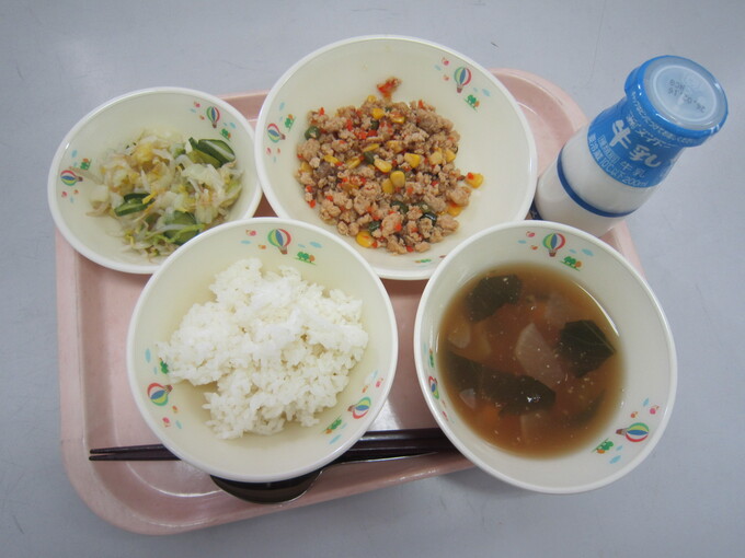 ごはん、牛乳、鶏そぼろ丼の具、浅漬け、吉野汁
