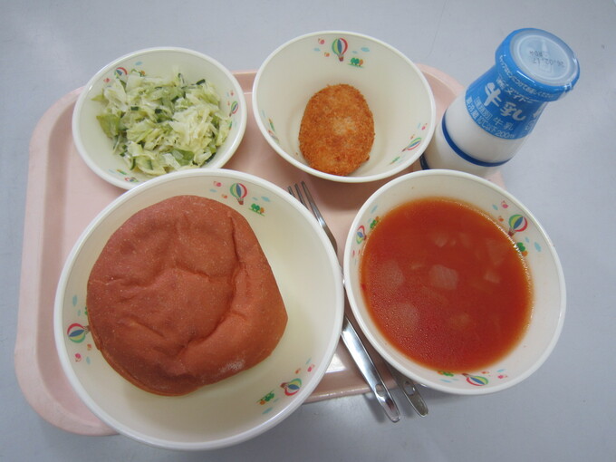 サンドイッチバンズパン、牛乳、エビカツ、コールスロー、ミネストローネ