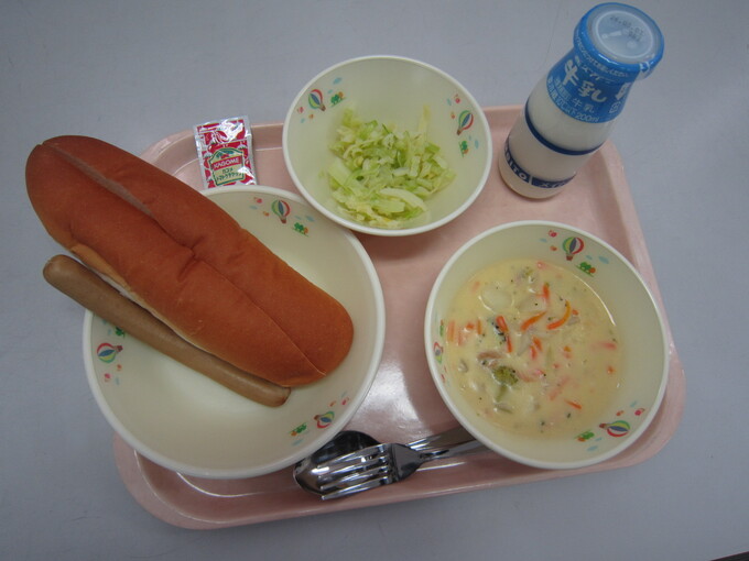サンドイッチロールパン、牛乳、ウインナー、一食用ケチャップ、ボイルキャベツ、クリームシチュー