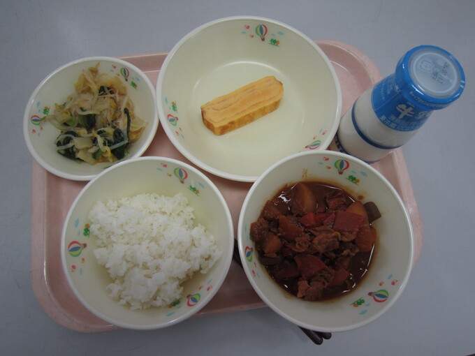 麦ごはん、牛乳、カレーライス、ビーンズサラダ、オレンジ