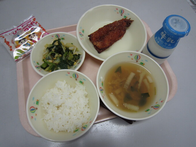 ごはん、牛乳、かますの竜田揚げ、菜の花あえ、うしお汁、ひなあられ