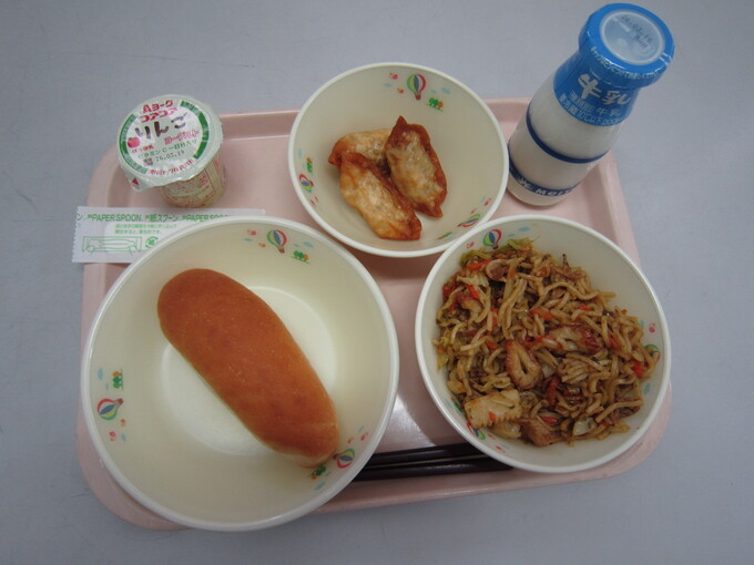 小型ロールパン、牛乳、焼きそば、揚げぎょうざ、りんごヨーグルト