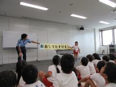 西枇杷島警察と名工建設さんと共同で5歳児の子ども達を対象に「交通安全・防災・防犯教室」を開いて頂きました。警察署前の横断歩道や歩道橋の渡り方の実践指導をして頂きました。名工建設社内では、交通安全のビデオを見せて頂き、地震の時の避難の仕方、非常持ち出し袋に入れる物などのお話を聞きました。また、防犯については、知らない人が声をかけてきたら大声を出すなど具体的に教えて頂きました。