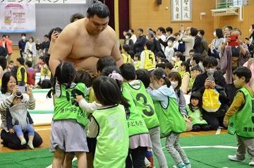 安治川部屋力士と子どもたちによる「ちびっこふれあい大相撲」では、約90名のちびっこ力士が参加し、力士との相撲や綱引き対決などを行いました。大きな身体の力士たちに、子どもたちも果敢に挑み、会場は大いに盛り上がりました。