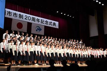 市制20周年を記念するショートムービーの上映や市制20周年事業表彰のほか、式典の後半では、講談師 旭堂 鱗林さんによる『清洲会議』の講談、市内4中学校合同による『KIYOSU CHORUS GROUP』の記念合唱が行われました。
